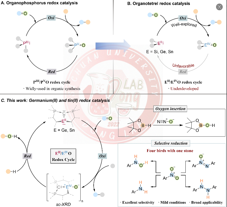 This work was published in Angew. Chem. Int. Ed. entitled “EII/EIVO (E = Ge, Sn) Catalyzed Nitrous Oxide Activation and Chemodivergent Reduction of Nitroarenes” (https://doi.org/10.1002/anie.202515638). Prof. Zhaowen Dong is the corresponding author of the paper, and Ph.D. candidate Zhuchunguang Liu, Master’s student Xiaojian Li and research assistant Zhijun Wang are the co-first authors. This work was financially supported by National Natural Science Foundation of China, the National Key R&D Program of China, and Natural Science Foundation of Sichuan, China and the Fundamental Research Funds for the Central Universities.